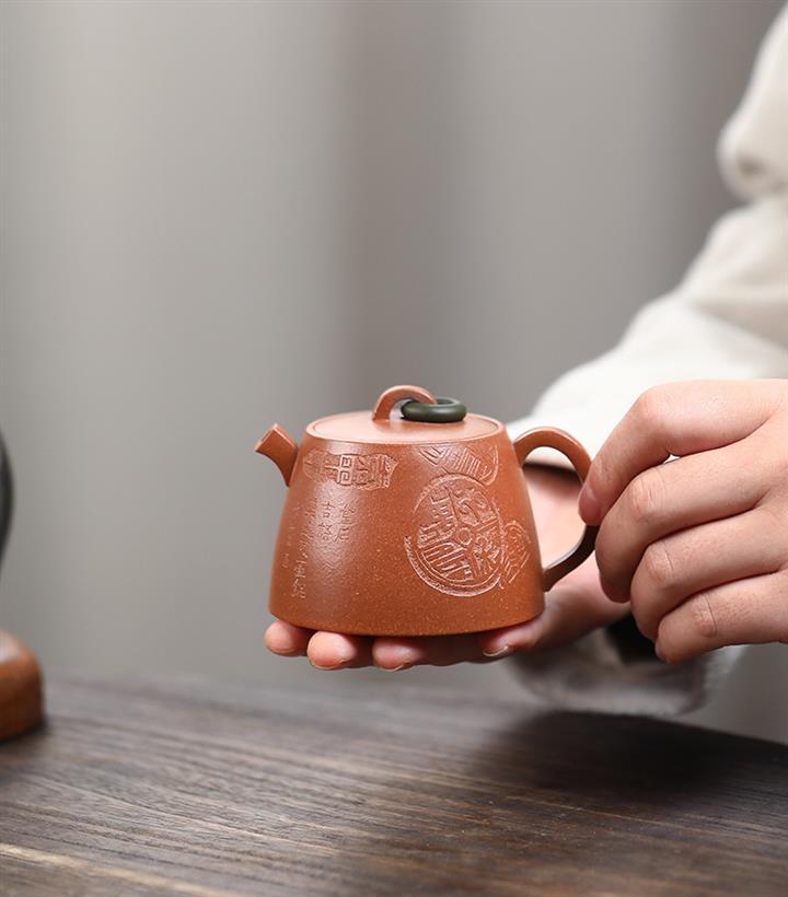 【泥料特點】砂土氣重,似淳實農民,日久使用,漸露鋒芒,養成變化,溫潤莊重。紫砂是壹種雙重氣孔結構的多孔性材質,氣孔微細,密度高。用紫砂壺沏茶,不失原味,且香不渙散,得茶之真香真味。紫砂使用越久,壺身色澤越發光亮照人,氣韻溫雅。紫砂壺長久使用器身會因撫摸擦拭,變得越發溫潤光澤。