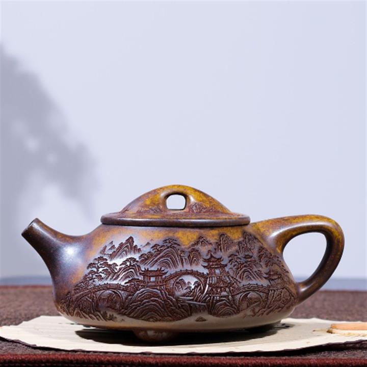 400cc原礦清水泥陶刻松影曲梁提梁茶壺POT8753