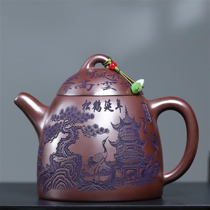 660cc原礦石紅泥滿刻山河鶴影茶壺POT8551