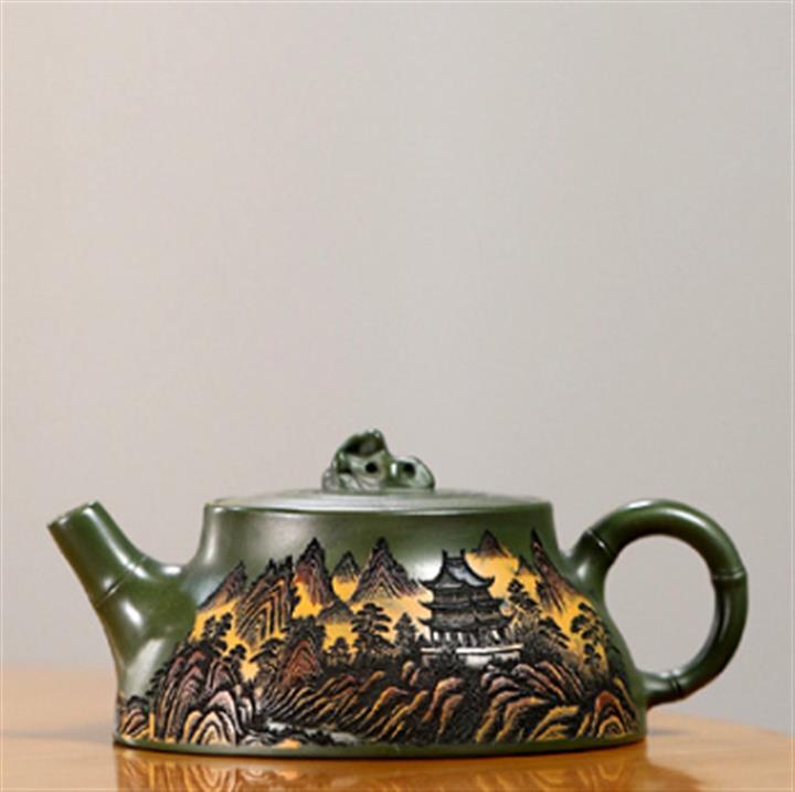 200cc原礦綠泥滿刻彩繪溪山映景茶壺POT9018